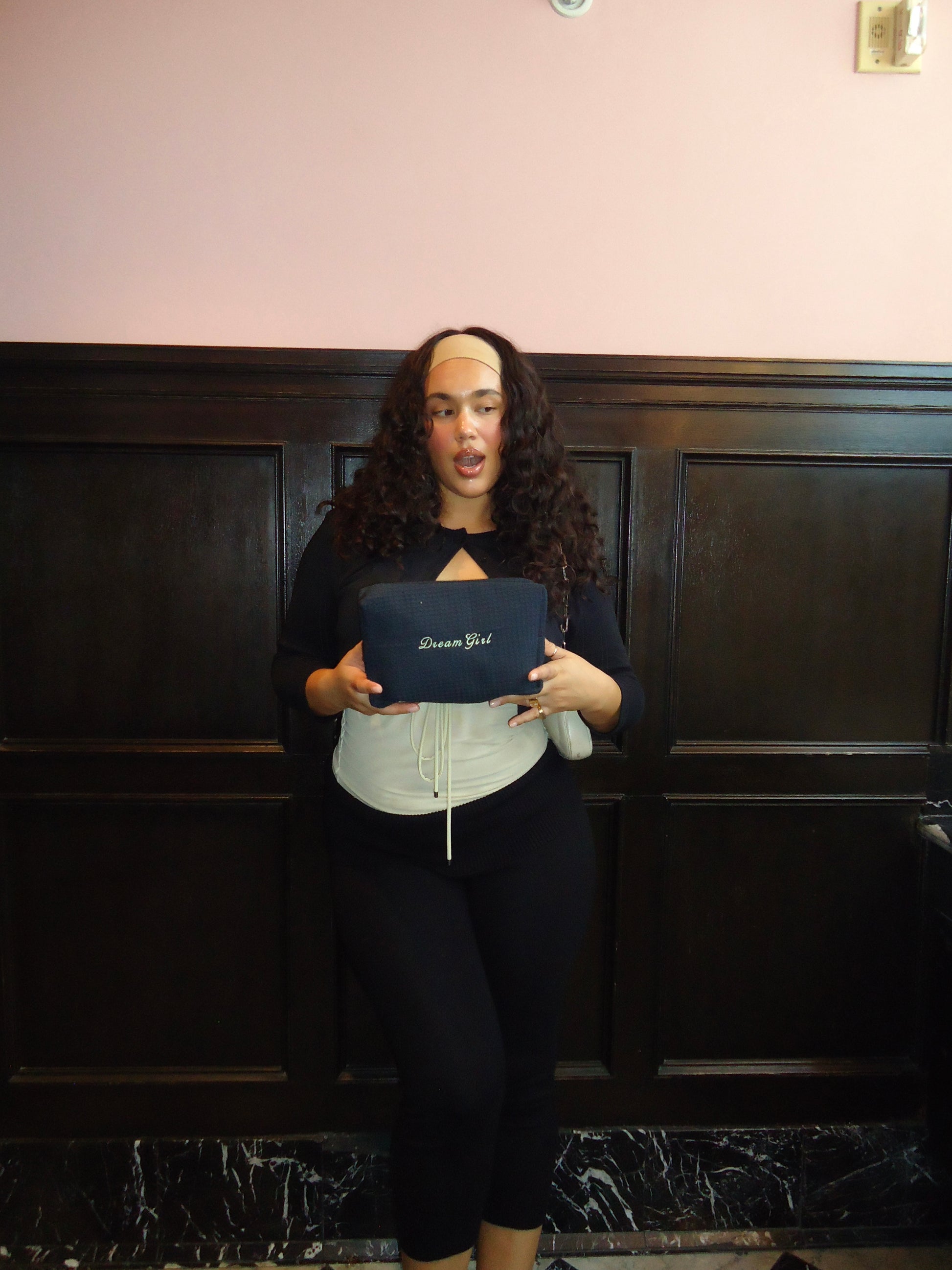 A soft cotton waffle weave with a padded exterior, zippered closure, and interior pocket to keep everything organized. Finished with a cotton handle for easy carrying and embroidered with “Dream Girl” in the color of your choice. Compact yet roomy enough for your daily essentials.
